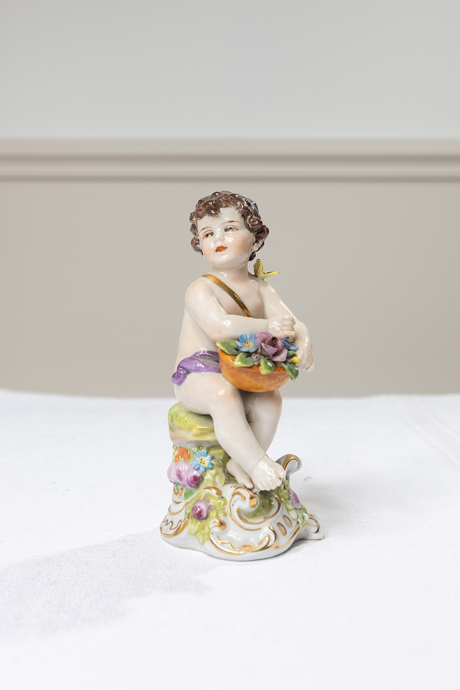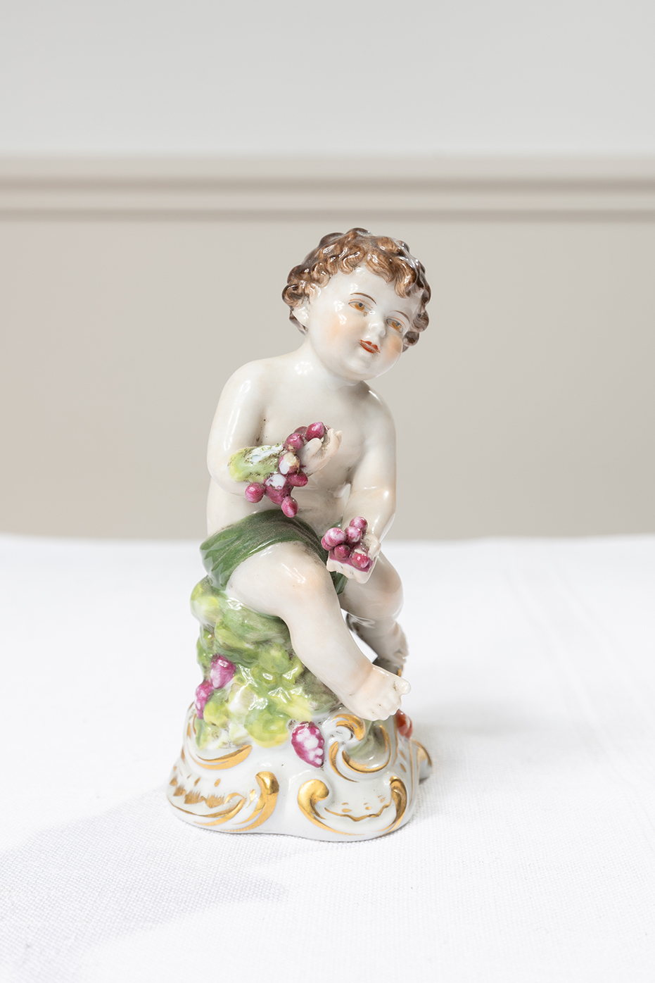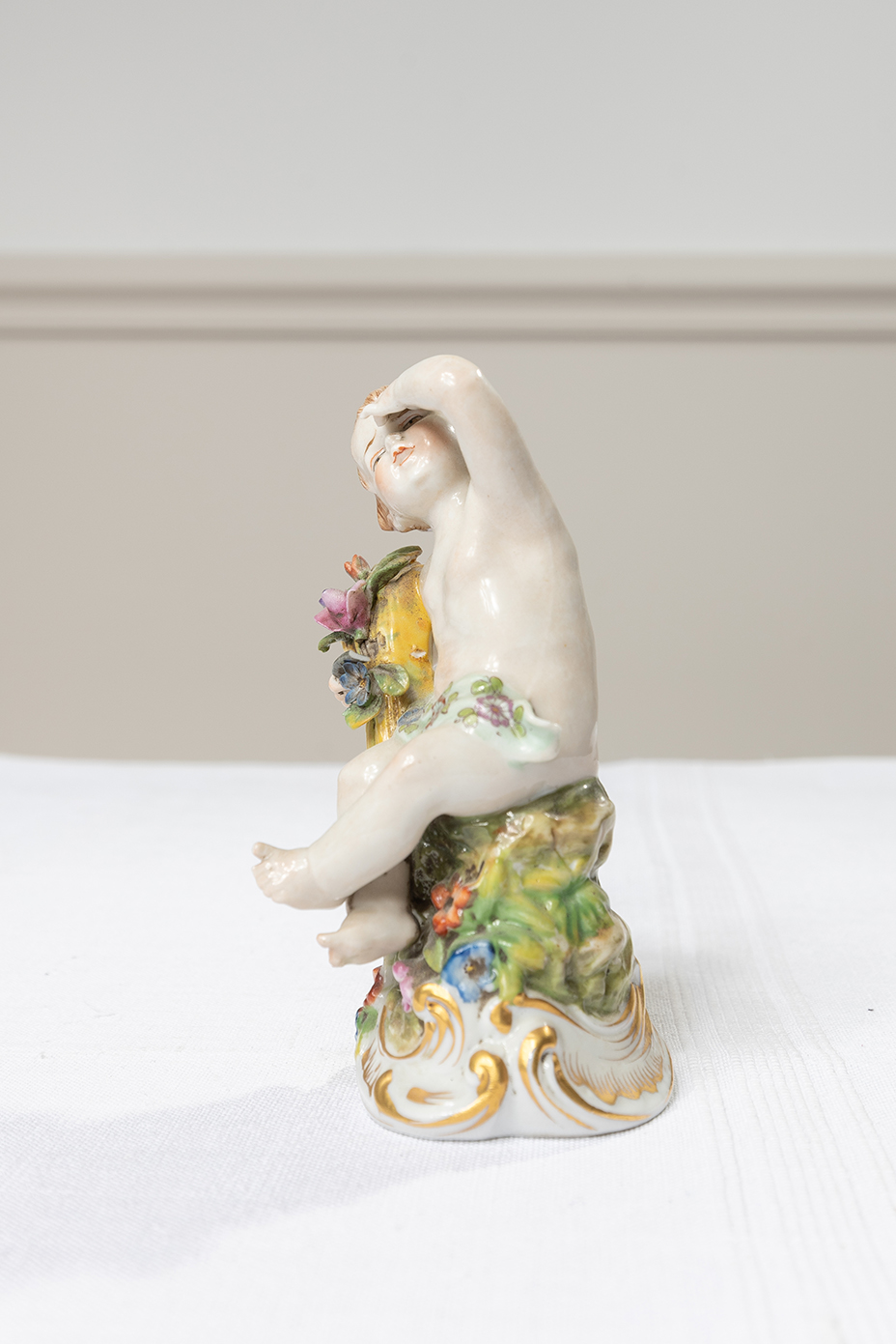 Charmante suite de quatre figurines en porcelaine polychrome, représentant des putti richement décorés, chacun tenant des attributs symboliques (fruits, fleurs, corbeille, guirlande).