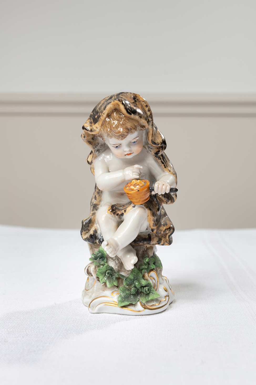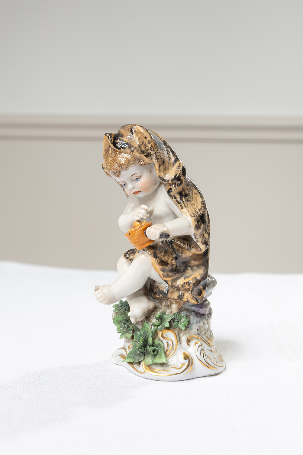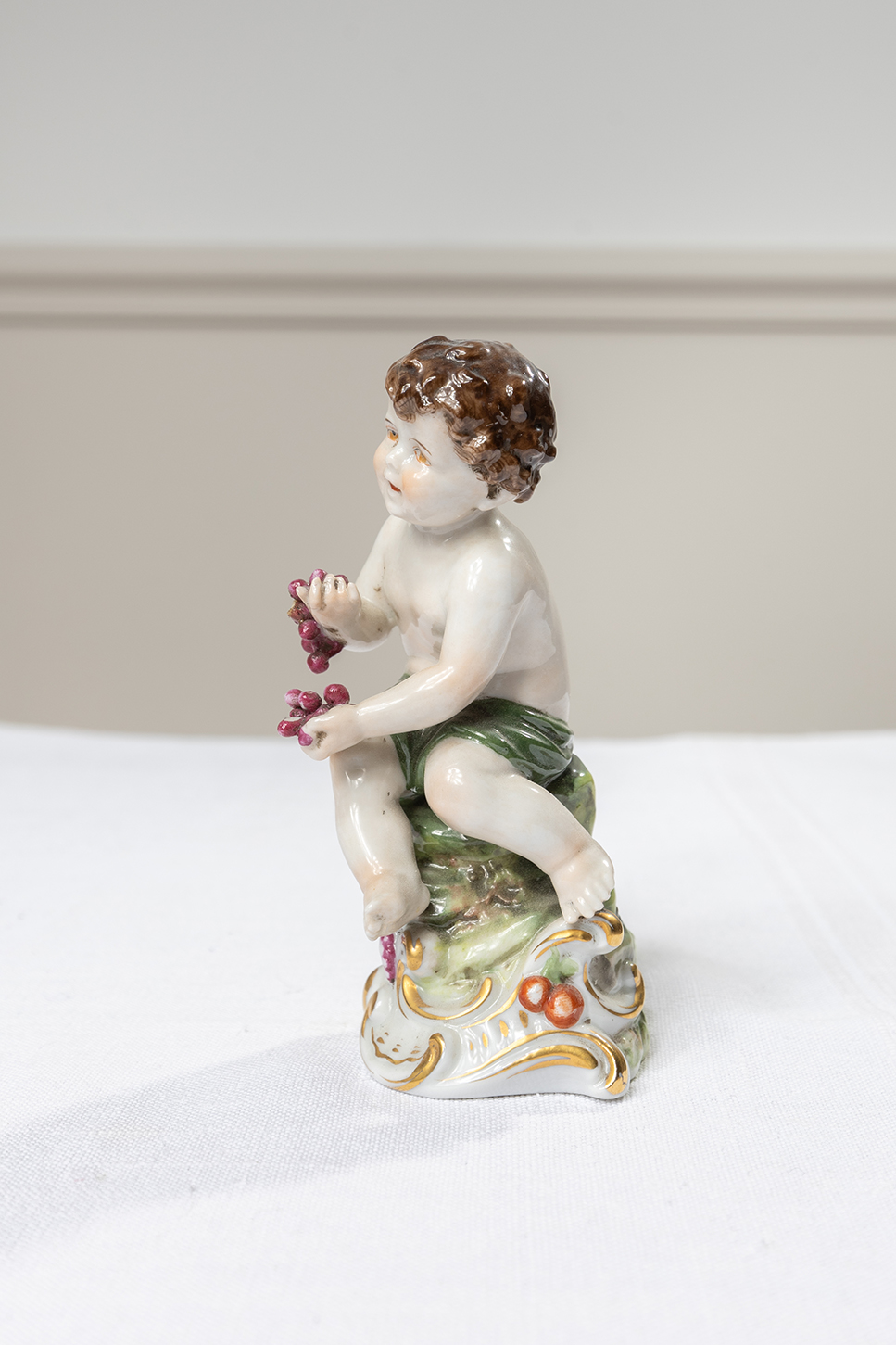 Charmante suite de quatre figurines en porcelaine polychrome, représentant des putti richement décorés, chacun tenant des attributs symboliques (fruits, fleurs, corbeille, guirlande).