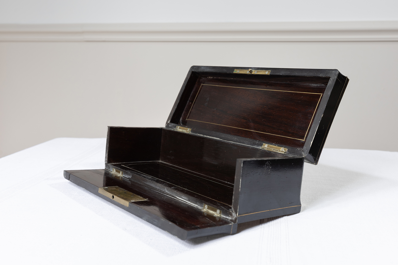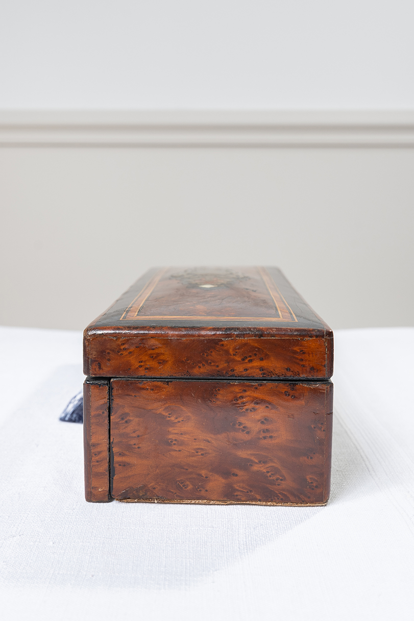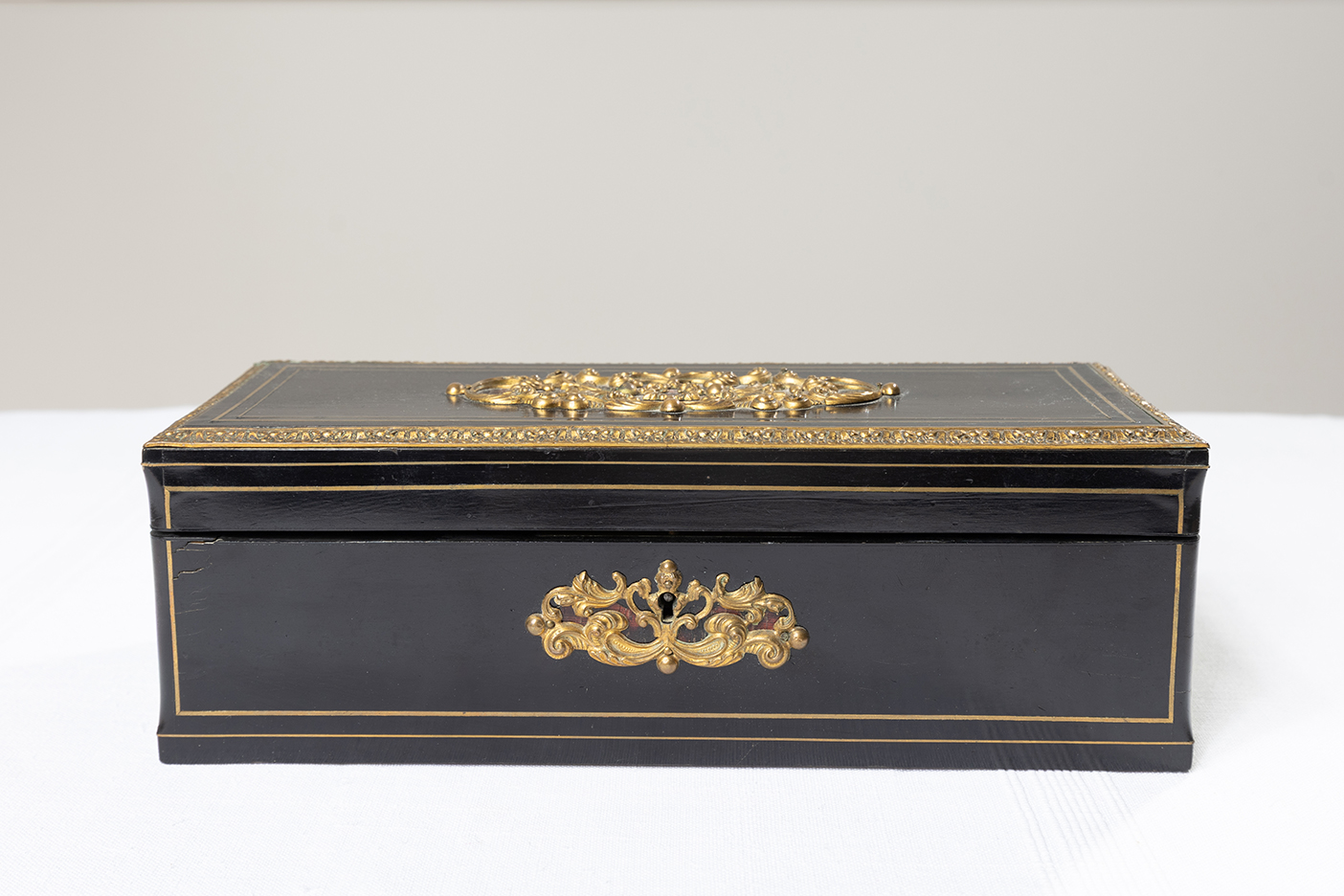 Son couvercle arbore de riches arabesques incrustées et un encadrement en bronze doré finement ciselé, typique de l’art décoratif français du XIXᵉ siècle.