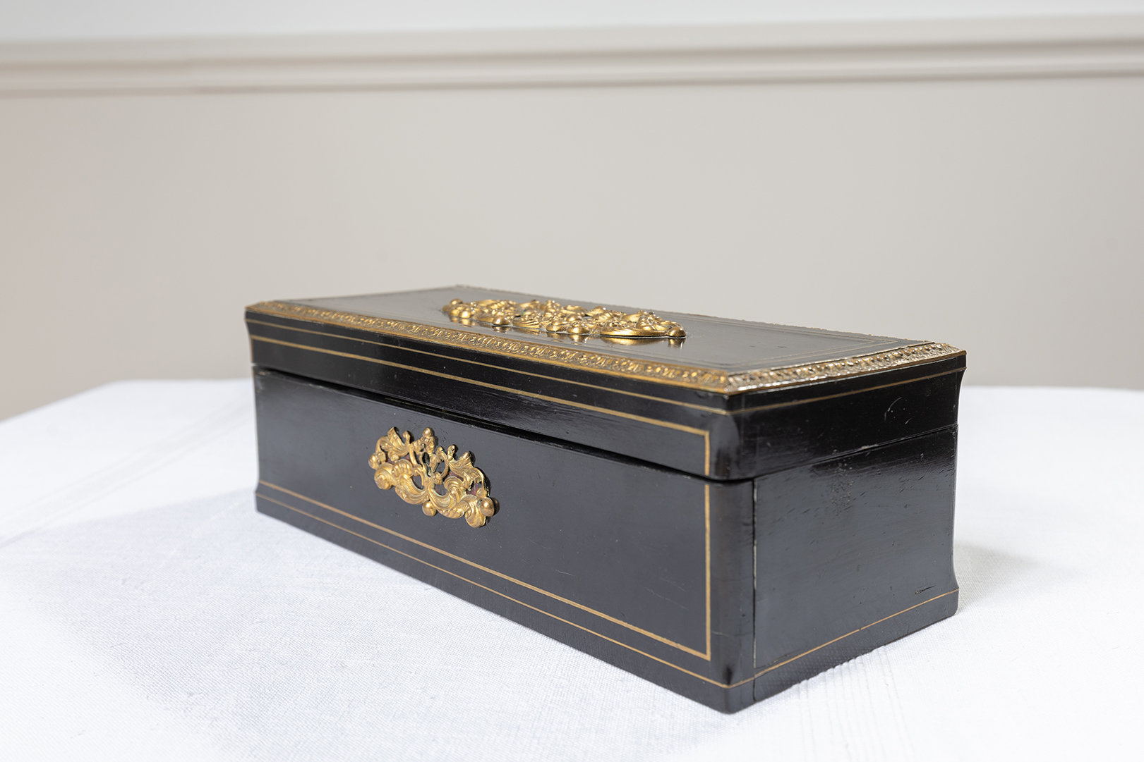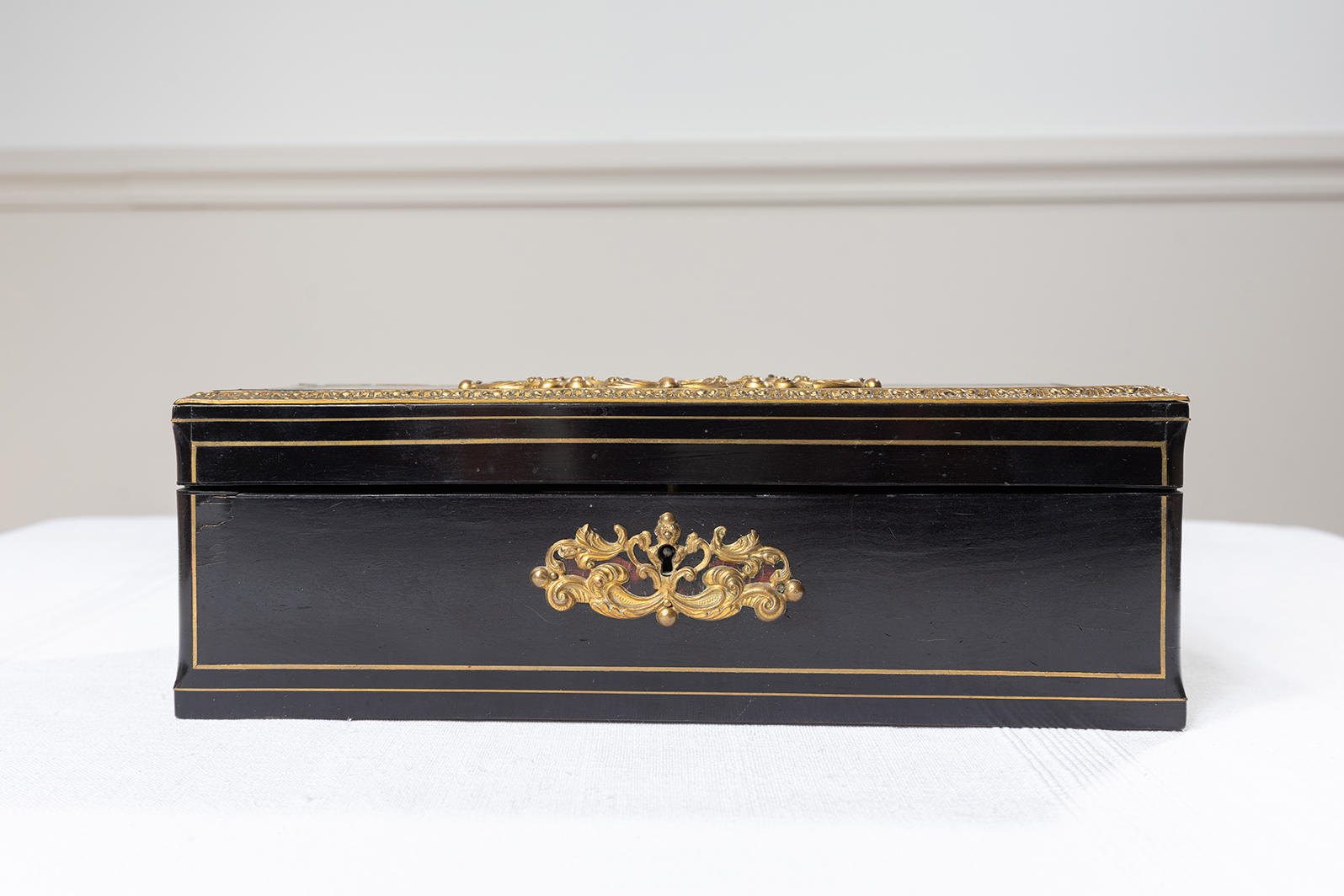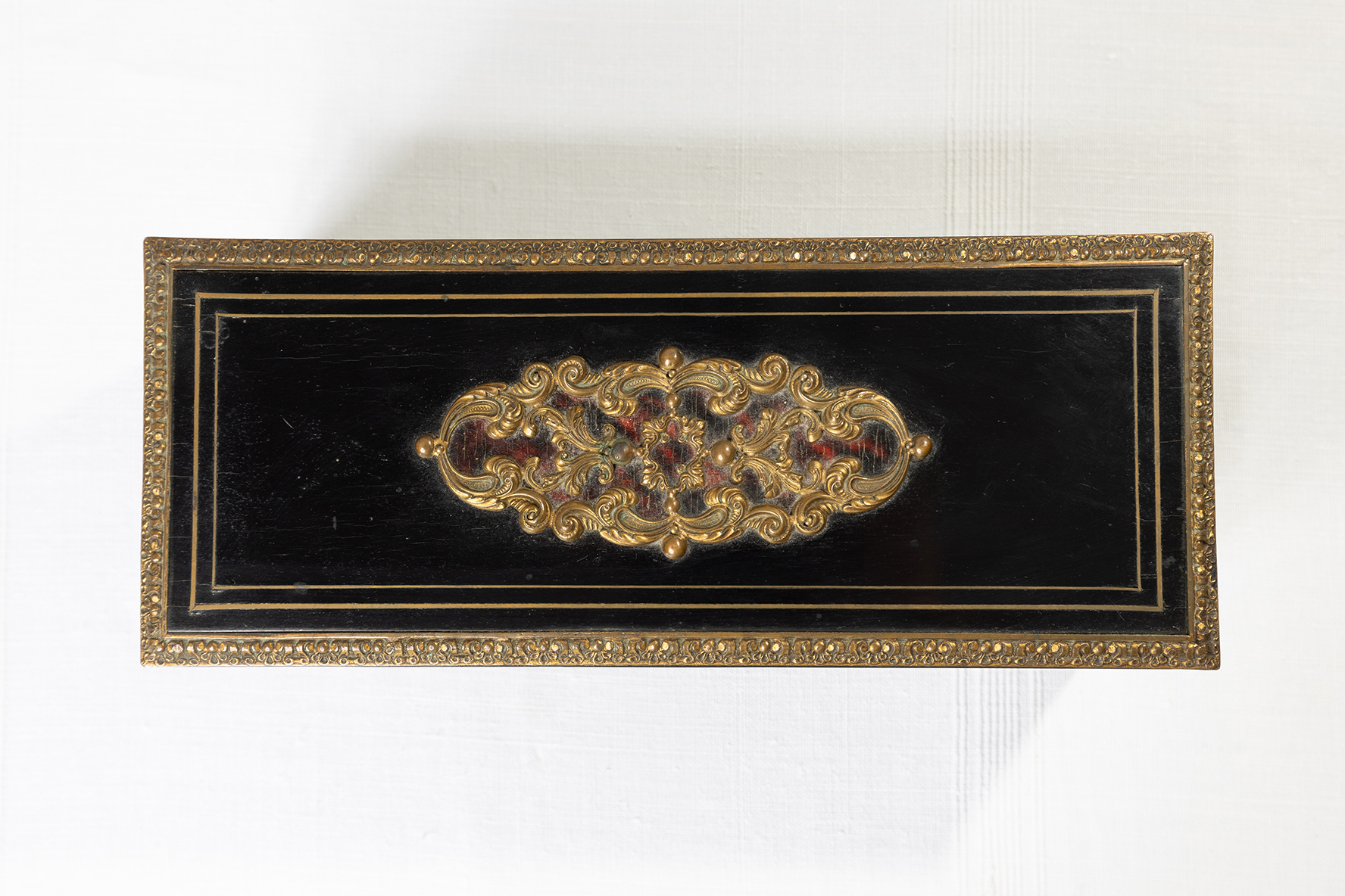 Élégante boîte à thé en bois noirci, décorée en marqueterie de laiton et d’écaille de tortue teintée rouge, dans le goût d’André-Charles Boulle.