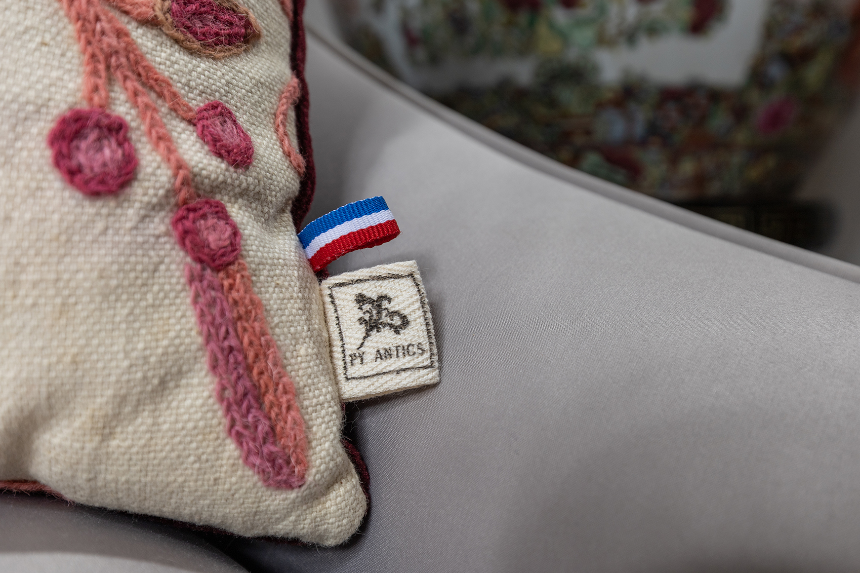 Élégant coussin rectangulaire en lin naturel, rehaussé d’une broderie florale aux tons chauds de rouge, framboise et rose de la marque PY A NTIKS.