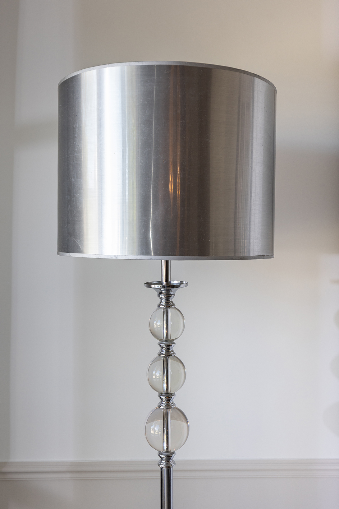 Élégant lampadaire au design années 1970, composé d’une structure en métal chromé poli et d’un fût rythmé par une succession de sphères en verre soufflé translucide.