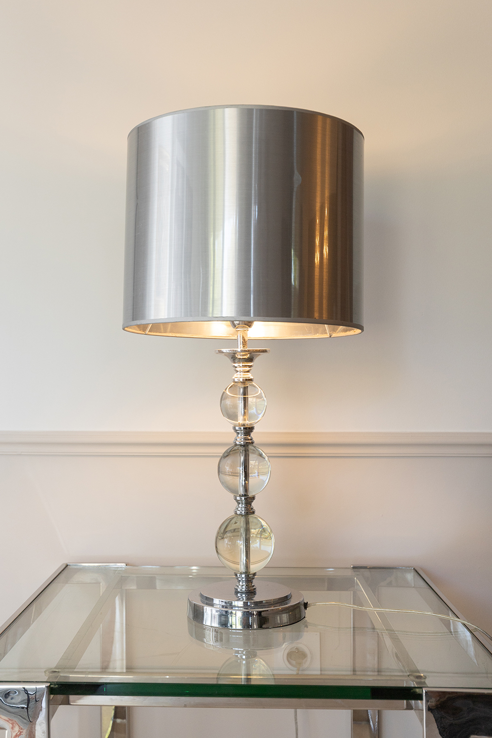 La silhouette élancée et la brillance du chrome contrastent avec la douceur du verre, créant un jeu de lumière raffiné et chaleureux. L’ensemble est coiffé d’un grand abat-jour cylindrique argenté, typique de l’esthétique glamour et futuriste des seventies.