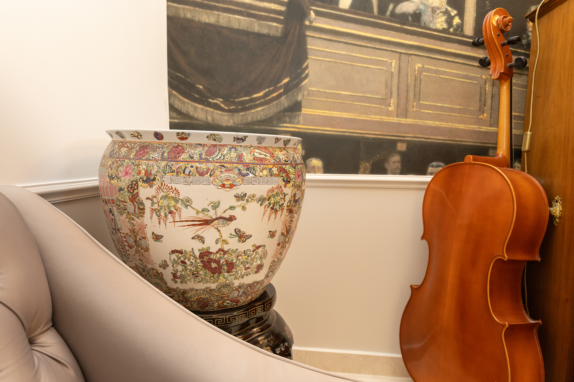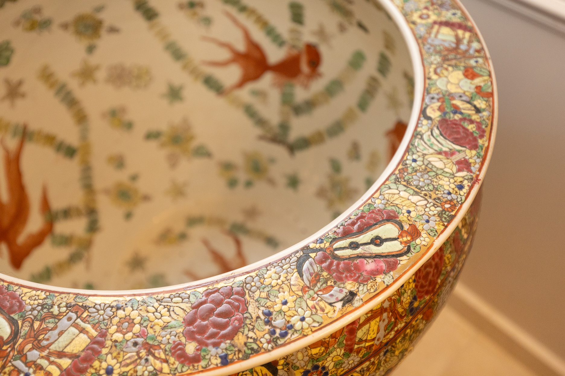 À l’extérieur, chaque pièce présente des scènes animées de palais, avec personnages en habits traditionnels, entourés de guirlandes fleuries, fruits et symboles de prospérité. L’intérieur est orné de carpes rouges nageant parmi des végétaux stylisés, motif porte-bonheur en Chine symbolisant la longévité, la force et l’abondance.
