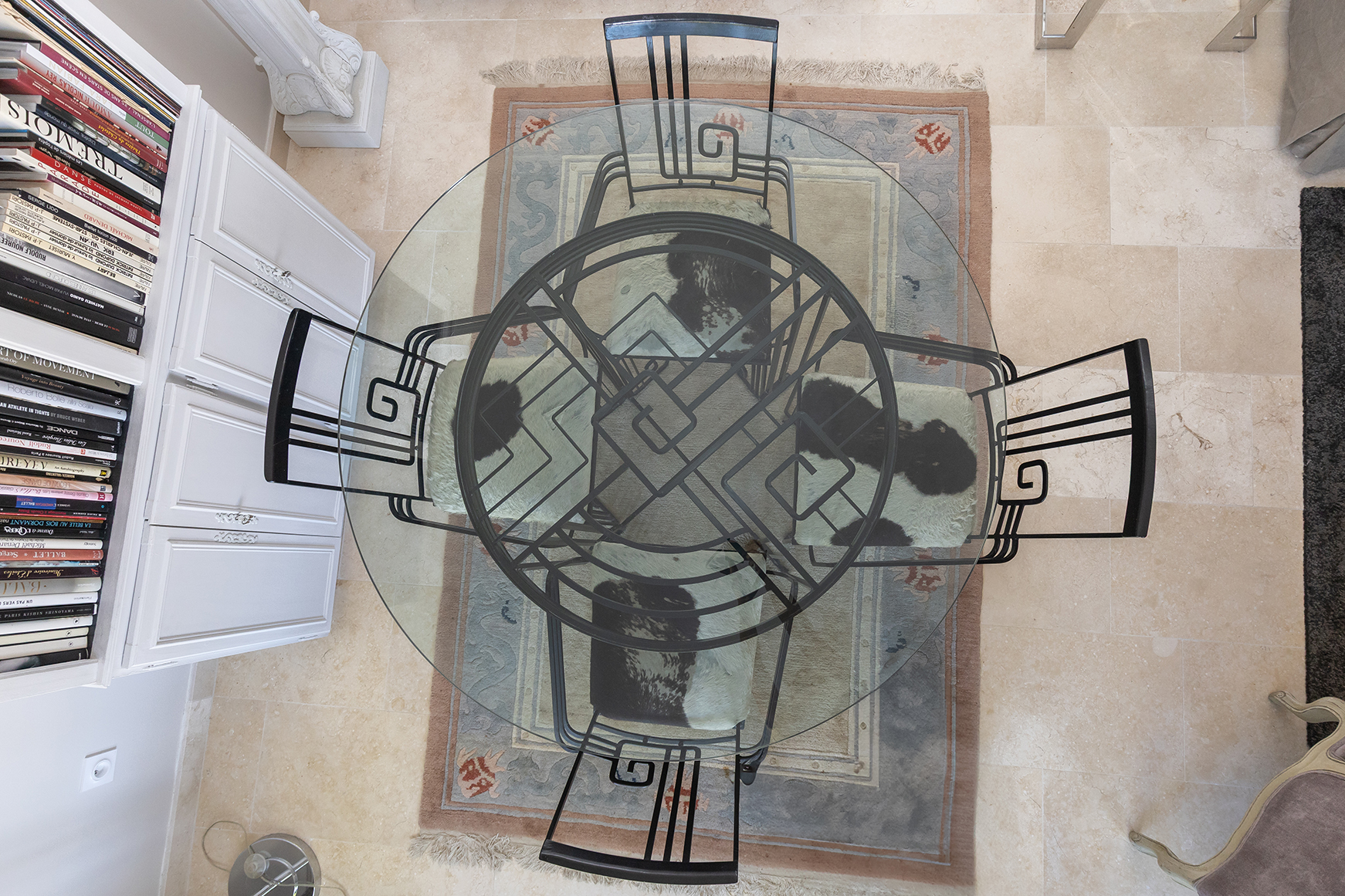 Leur silhouette géométrique et minimaliste est soulignée par un grand abat-jour cylindrique argenté, qui diffuse une lumière douce et contemporaine. Ce contraste entre la brillance du chrome, la transparence du verre et la modernité du cylindre argenté incarne parfaitement l’esthétique glamour et futuriste des seventies.