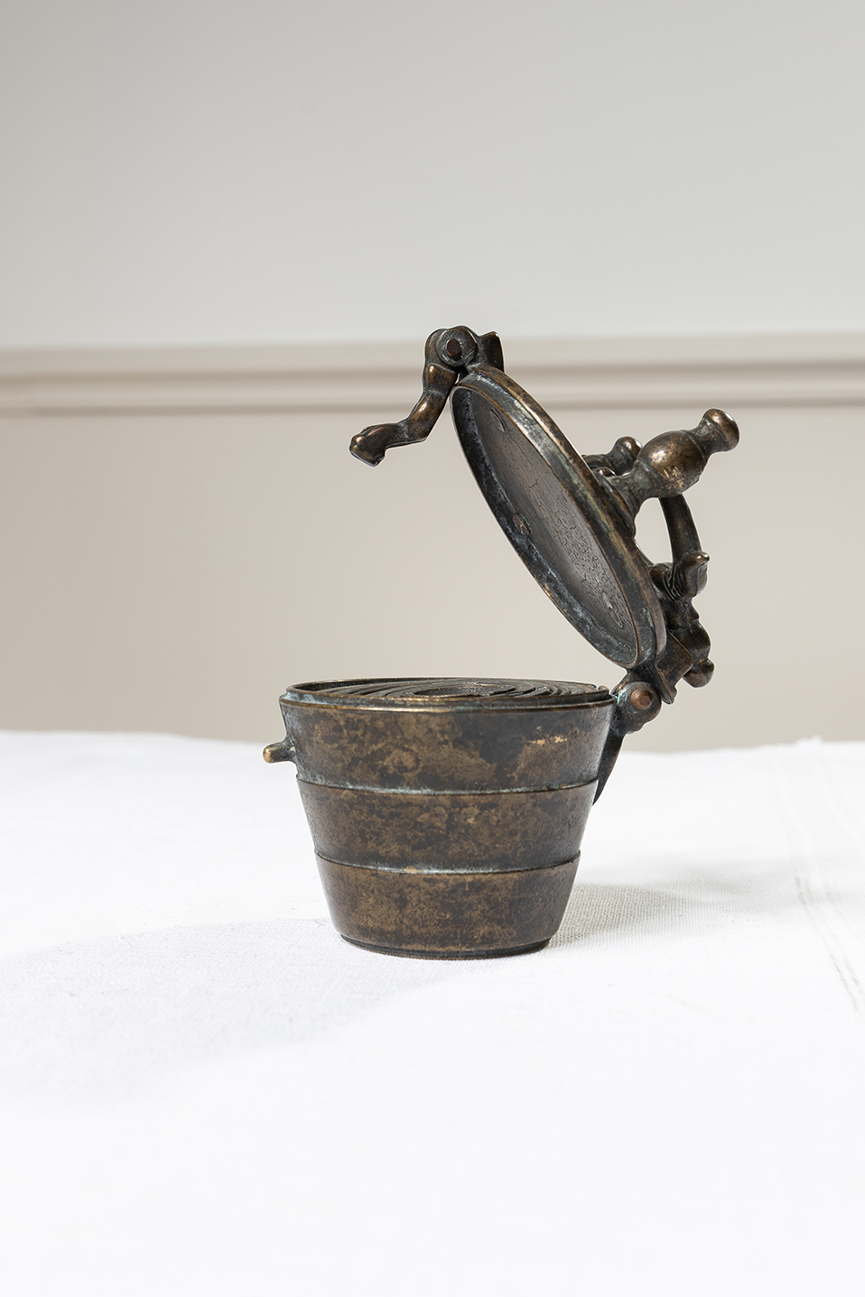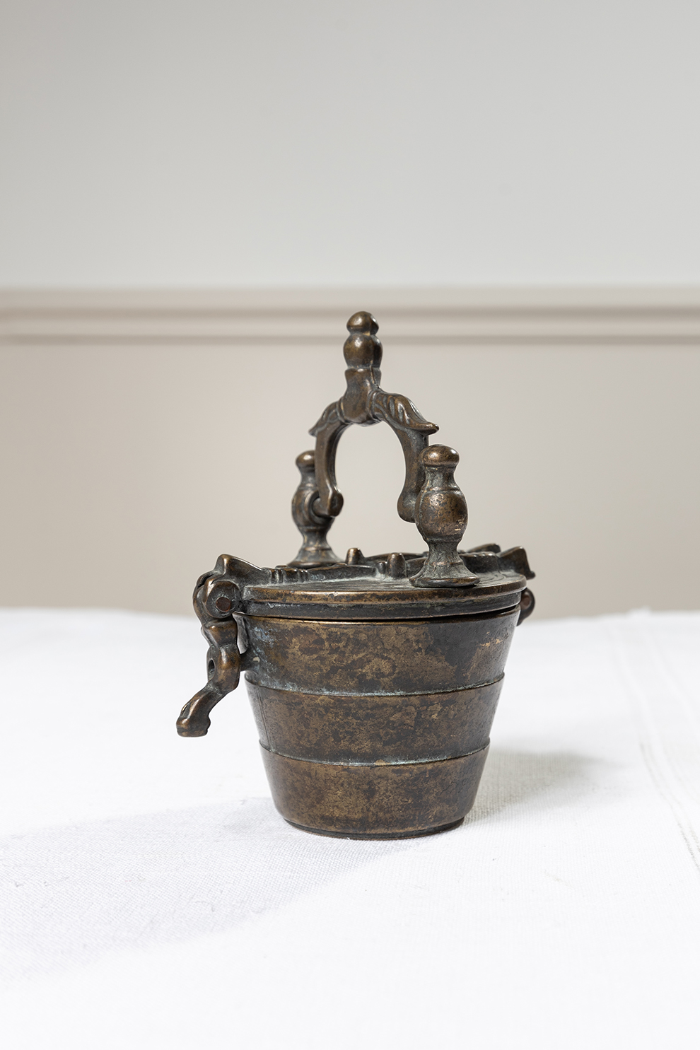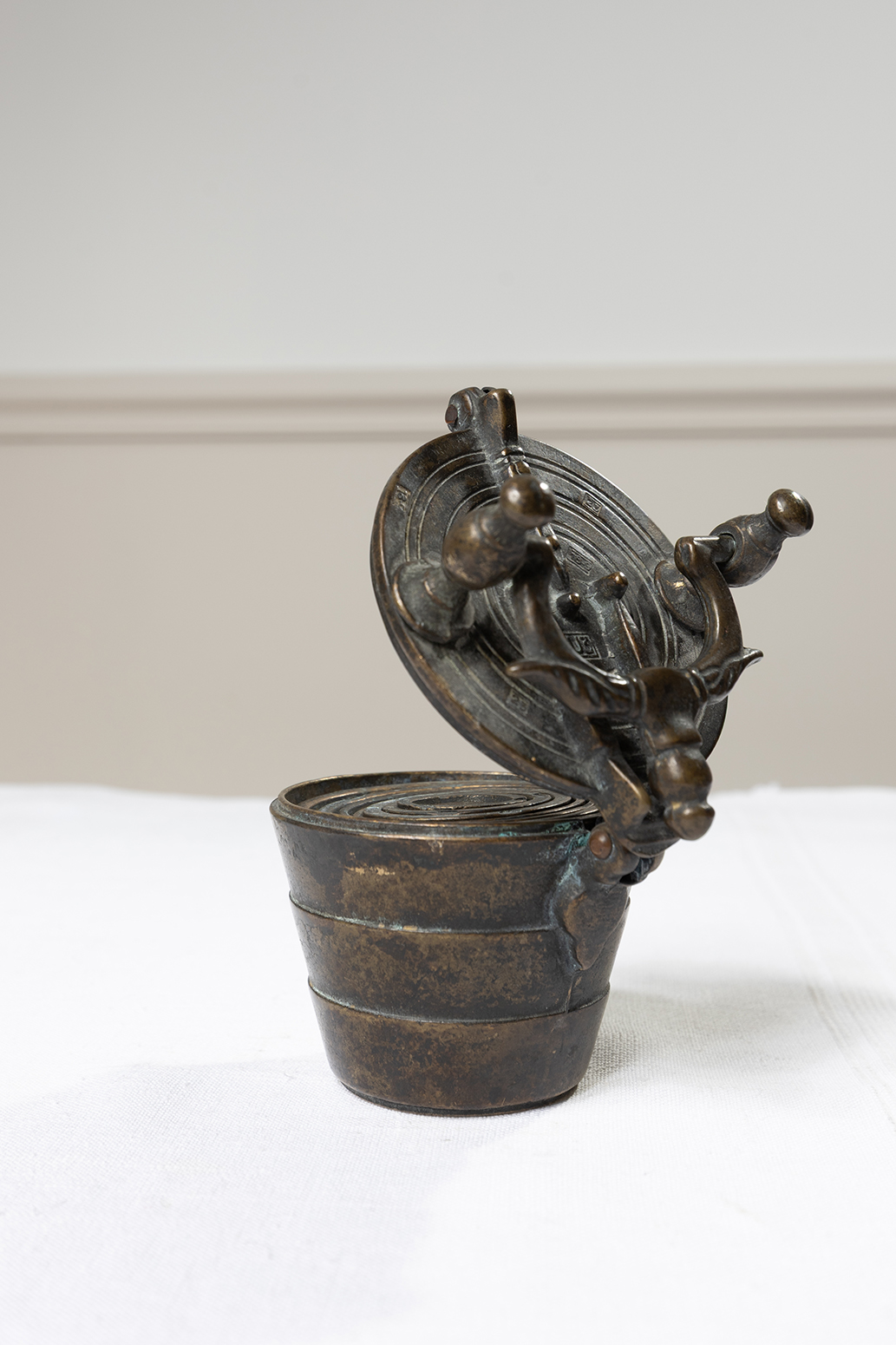 Rare poids de changeur à godets gigognes, en métal patiné, complet avec son couvercle articulé et ses anses à motif balustre.