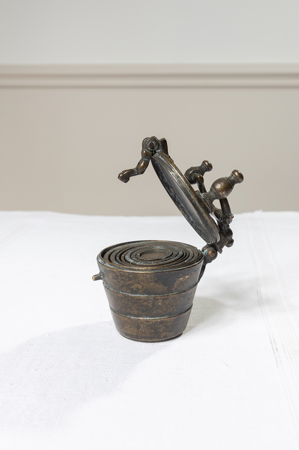 Chaque godet s’emboîte dans le suivant, permettant de recomposer l’ensemble dans un seul récipient compact. Ce type d’objet, utilisé par les changeurs et commerçants, témoigne du raffinement des instruments de mesure entre le XVIIe et le XIXe siècle.
