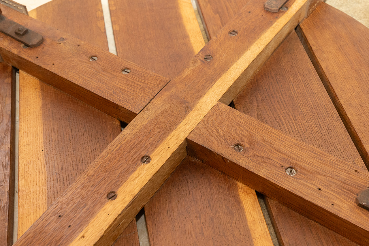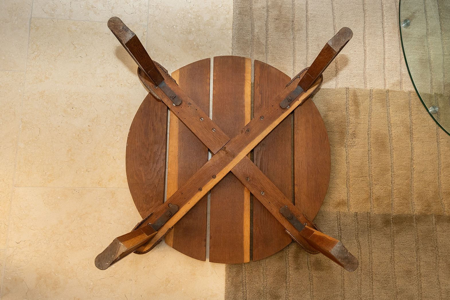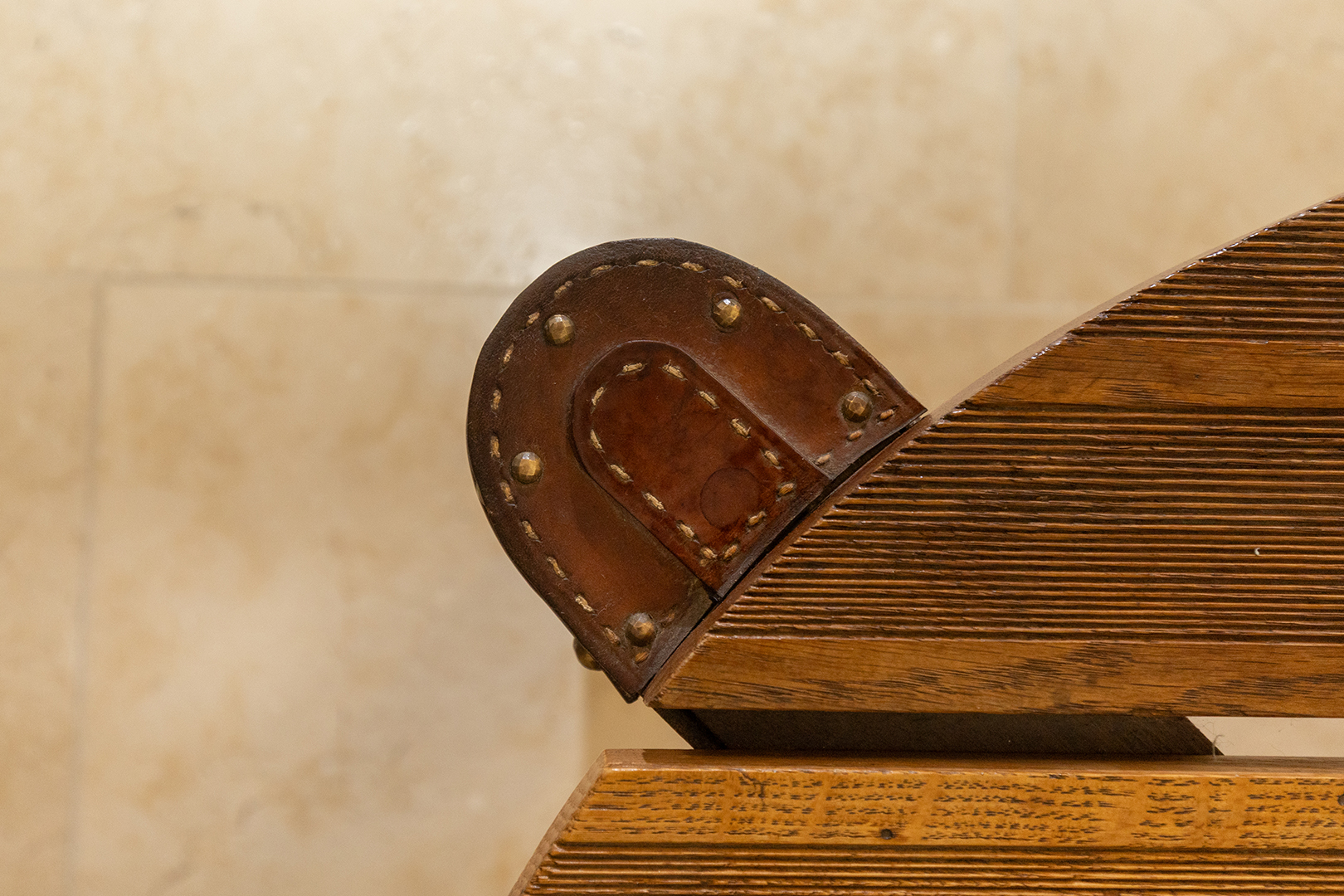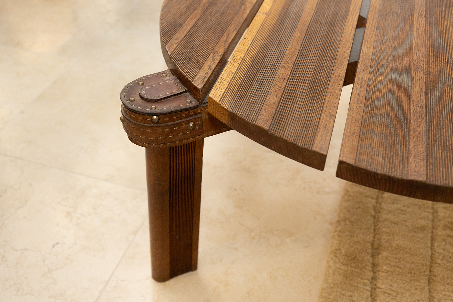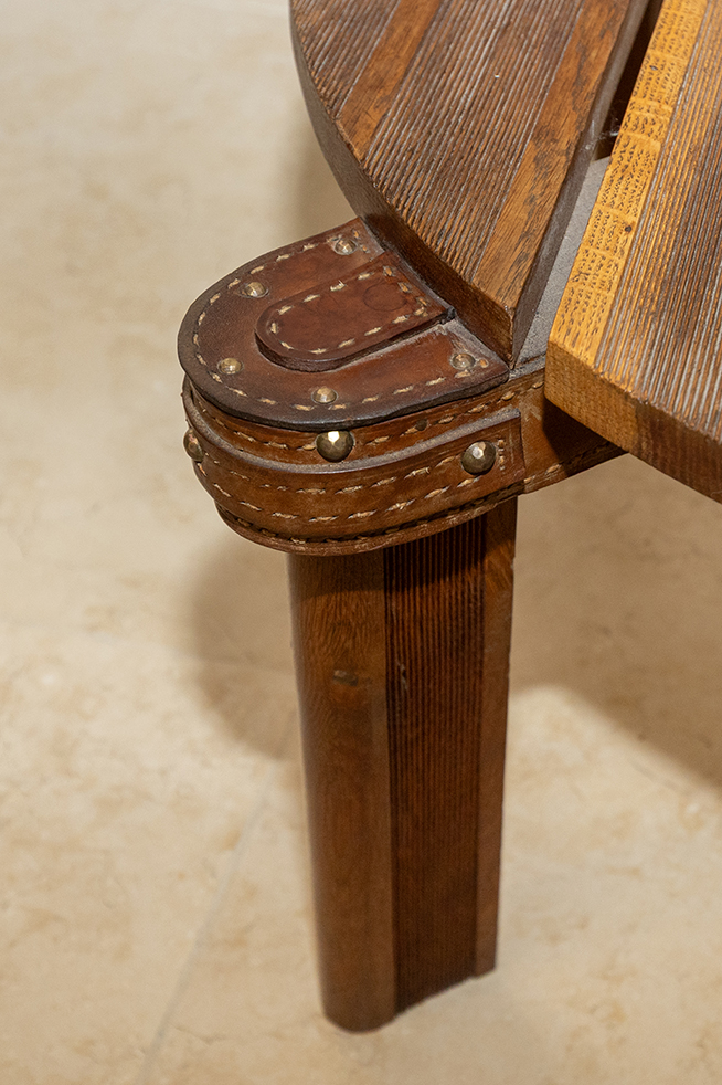 Le plateau en chêne présente une belle patine, soutenu par un piétement gainé de cuir brun cousu main avec surpiqûres sellier, détail emblématique du travail d’Adnet. Les proportions sobres et l’association du bois et du cuir confèrent à cette table une allure à la fois moderne et raffinée, typique du design français d’après-guerre.